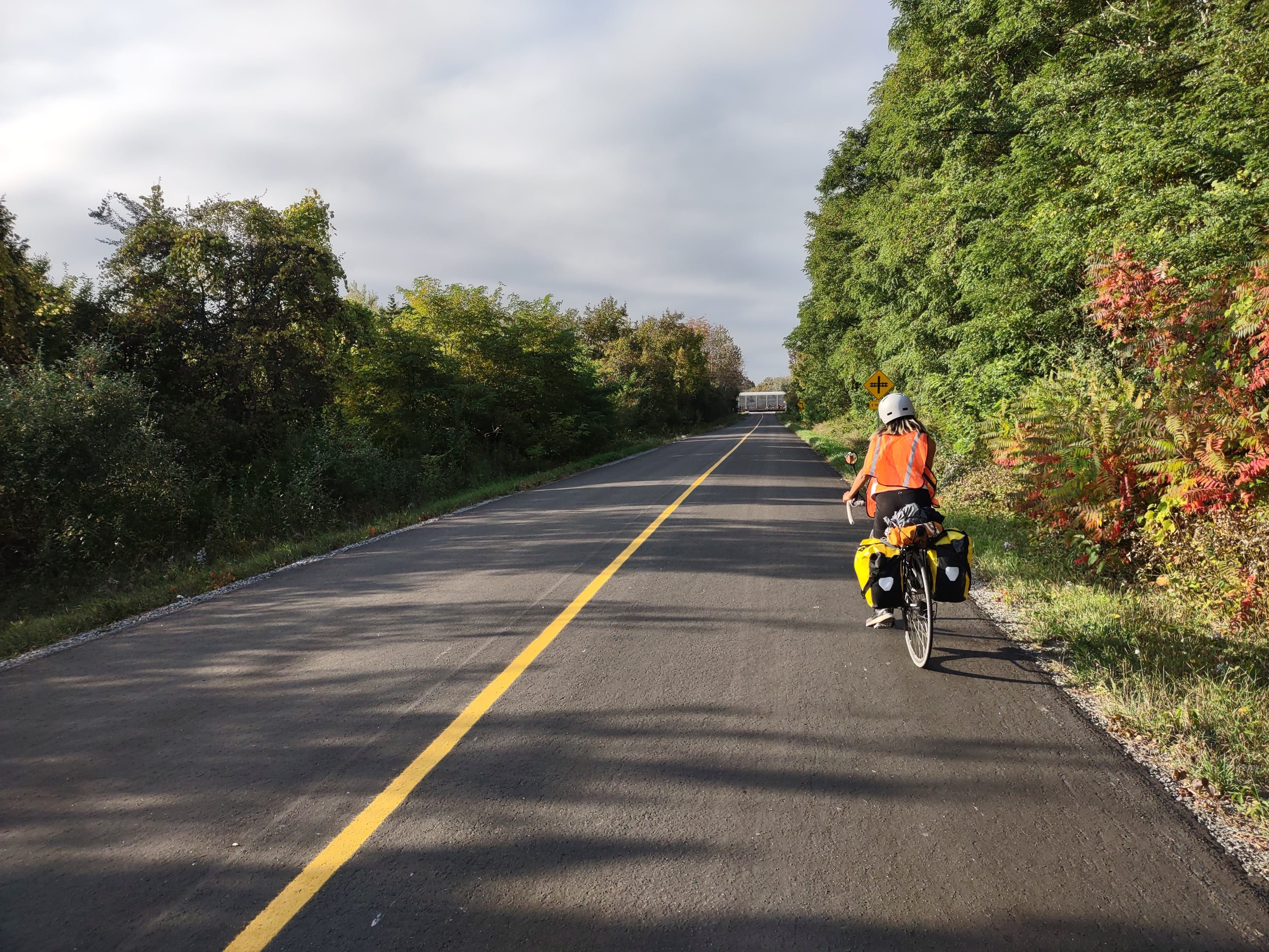 We picked up some postcards from an antique shop nearby and found one from the Wilmington Arts Society in Delaware! We had to send that one home. We got back on the wildflower-lined roads, passing orchard after orchard along the way to Bowmanville. As sunset approached, we were grateful for the view and snacks at the New Castle marina. The flora along the next connecting bike-dedicated trail was getting thicker now, and past trail users had installed some adorable gnome exhibits and painted rock gardens. We made an important stop at Skylight Donuts to buy out their last stock of the day just before reaching our resting place.
