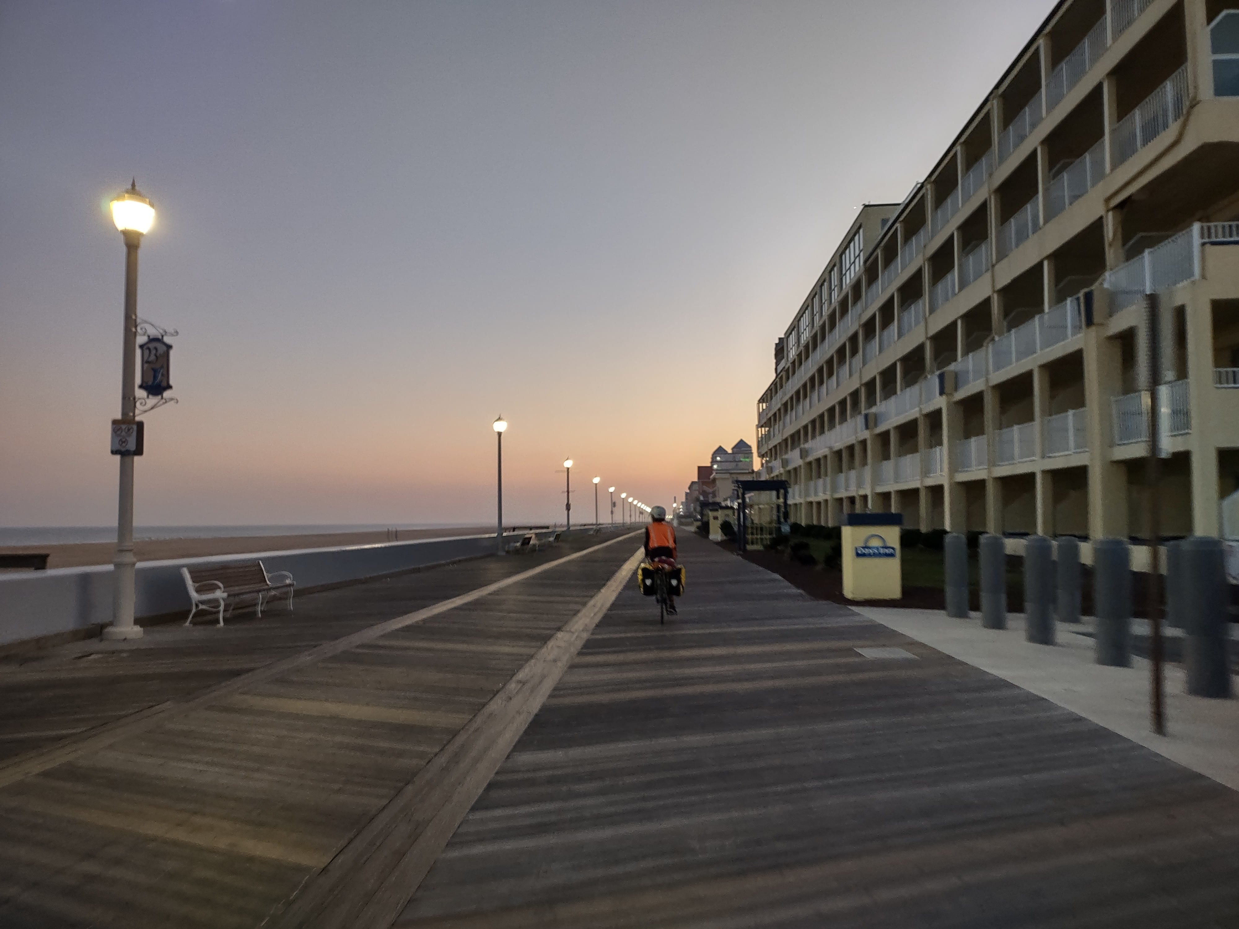 For the final stretch into Ocean City, we had a full bus & bike lane to ourselves for more than 5 miles. The streets were densely lined with stores & restaurants while beach front apartments, condos and hotels towered above us. With a few miles to go, we stopped off grocery store and then took a short detour onto the boardwalk.
